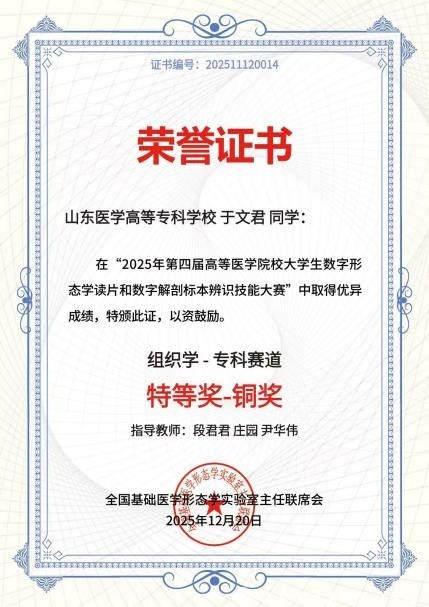近日,第四届高等医学院校大学生形态学读片和数字解剖标本辨识技能现场总决赛圆满落幕。山东医学高等专科学校学子在比赛中斩获特等奖金奖1项、铜奖1项。