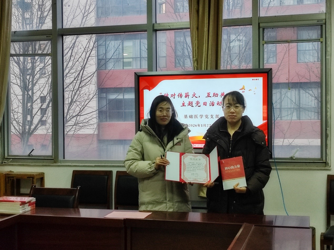 1 月 22 日,基础医学党支部于党员活动室开展主题党日活动,启动党员骨干教师与青年教师 “结对传薪火,互助共成长” 专项培育工作,支部全体党员同志参加本次活动。